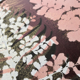 I first discovered Akua inks during a particularly humid summer when everything else was drying too quickly. These water-soluble inks transformed my printing practice. The way they capture the delicate veining of a Japanese maple leaf or the intricate texture of a fern frond is one I return to in my own studio. The bowl below was made with these inks and I love the faded gradeur feeling of the piece, with worn gold on the bowl itself and a fragment of textile which suggests its been treasured for a few generations. I used mask/ stencils ahich I handcut and quite a number of layers to build up the 'historical artefact' look.
